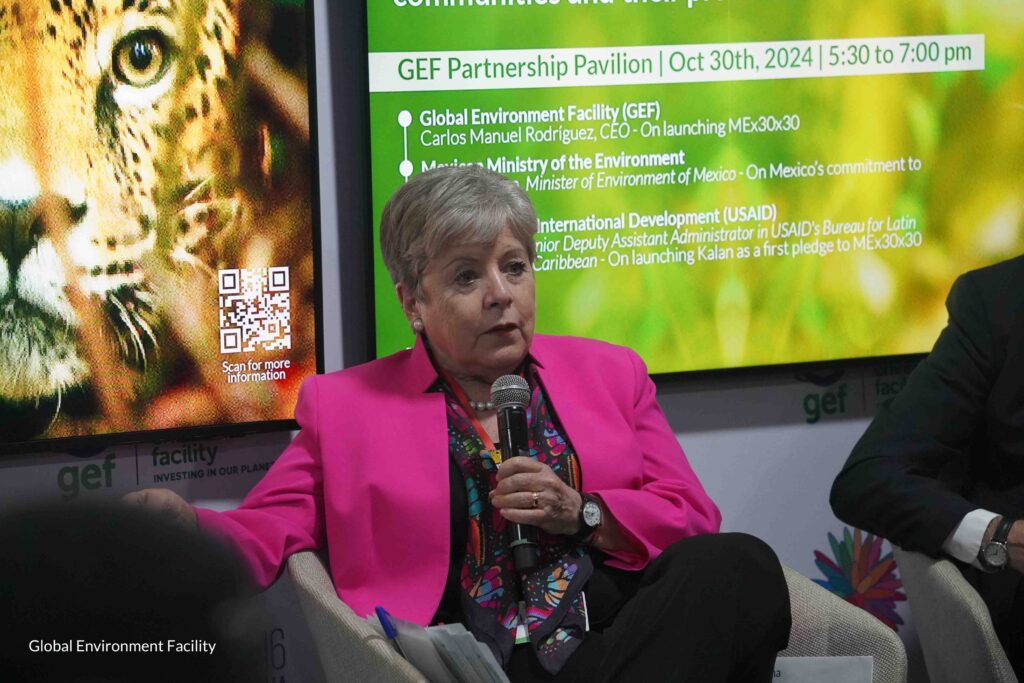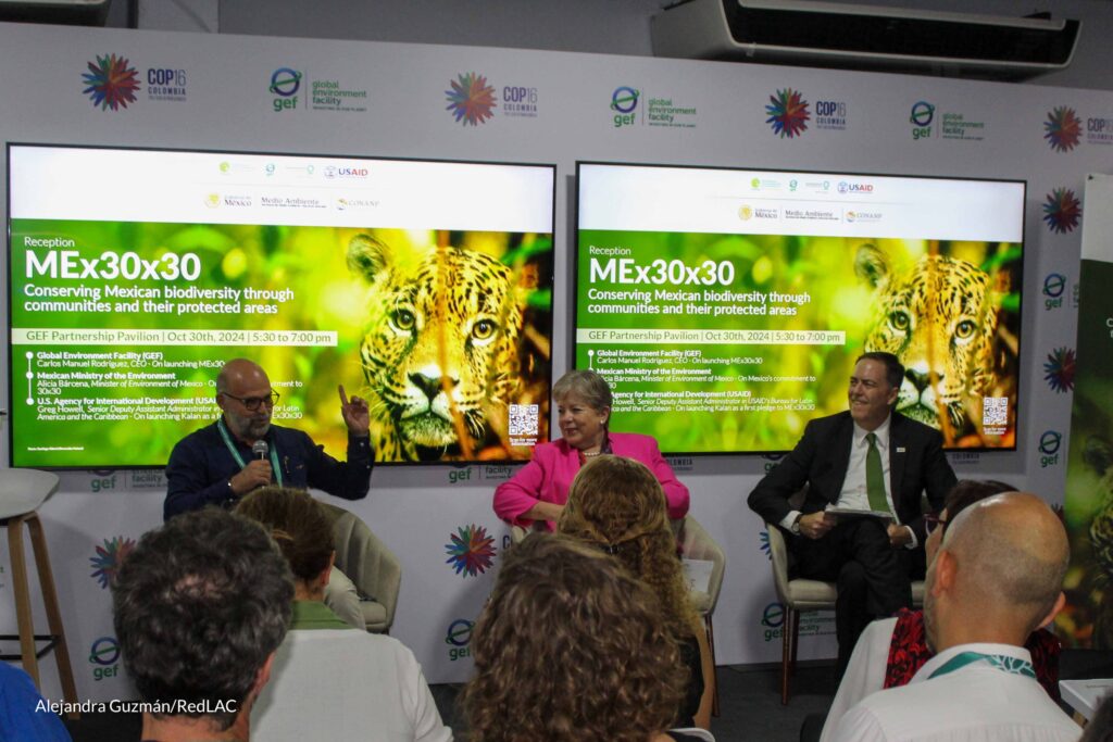 Durante la COP16, el Gobierno de México celebró el inicio de MEx30x30: Conservando la biodiversidad mexicana a través de las comunidades y sus áreas naturales protegidas, que se alinea a las 48 metas establecidas en la Estrategia Nacional sobre Biodiversidad. La presentación de MEx30x30 contó con la participación Carlos Manuel Rodríguez, Director Ejecutivo del GEF; Alicia Bárcena, Secretaria de Medio Ambiente y Recursos Naturales (SEMARNAT) de México; Greg Howell, Administrador Adjunto Senior de la Oficina para América Latina y el Caribe de USAID; Patricia Zurita, Directora de Estrategia de Conservación Internacional (CI); y Renée González, Directora General de FMCN.