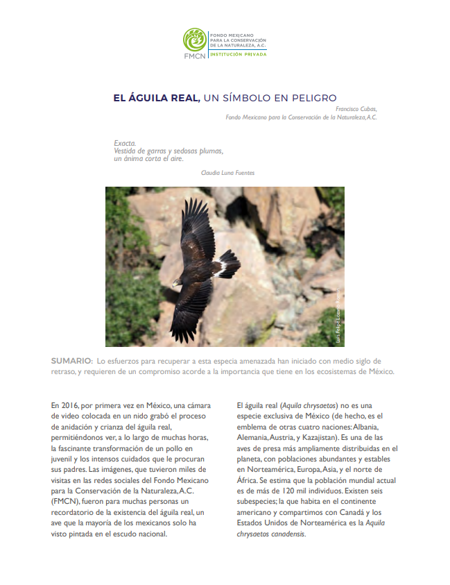Este documento destaca los esfuerzos y desafíos en la conservación del águila real en México. En 2008, se inició el Programa de Acción para la Conservación de la Especie (PACE), que involucra a diversas organizaciones y comunidades en acciones como el monitoreo de nidos, la identificación de amenazas y la educación ambiental.