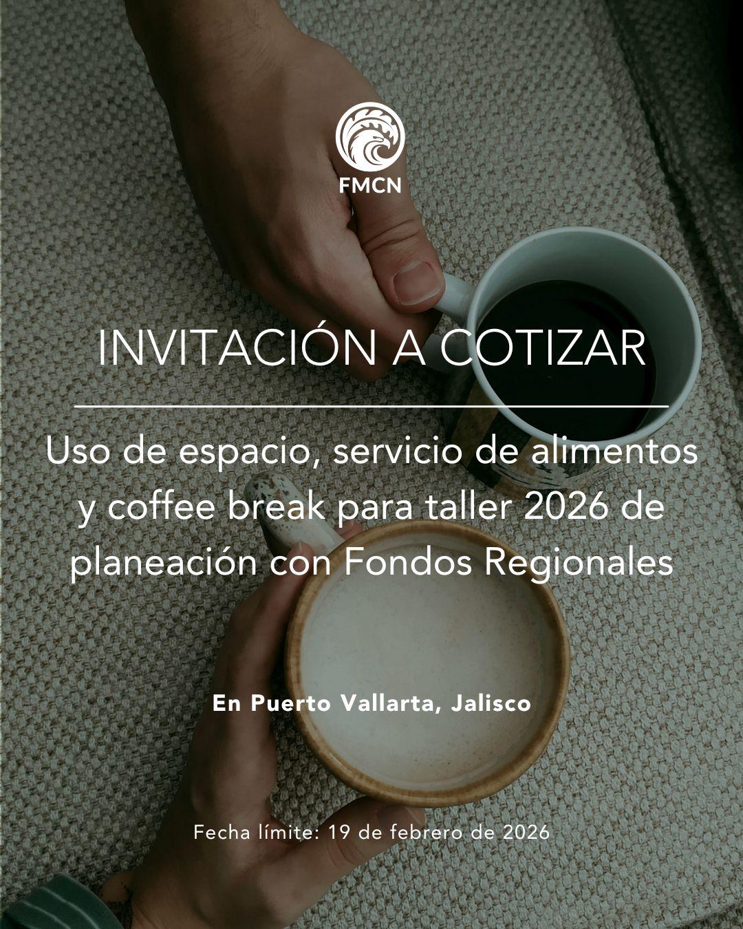 Fondo Mexicano para la Conservación de la Naturaleza (FMCN) le invita a presentar una cotización para “Uso de espacio y servicio de alimentos y coffee break para taller 2026 de planeación con Fondos Regionales” a llevarse a cabo los días 03, 04 y 06 de marzo de 2026 en Puerto Vallarta, Jalisco.