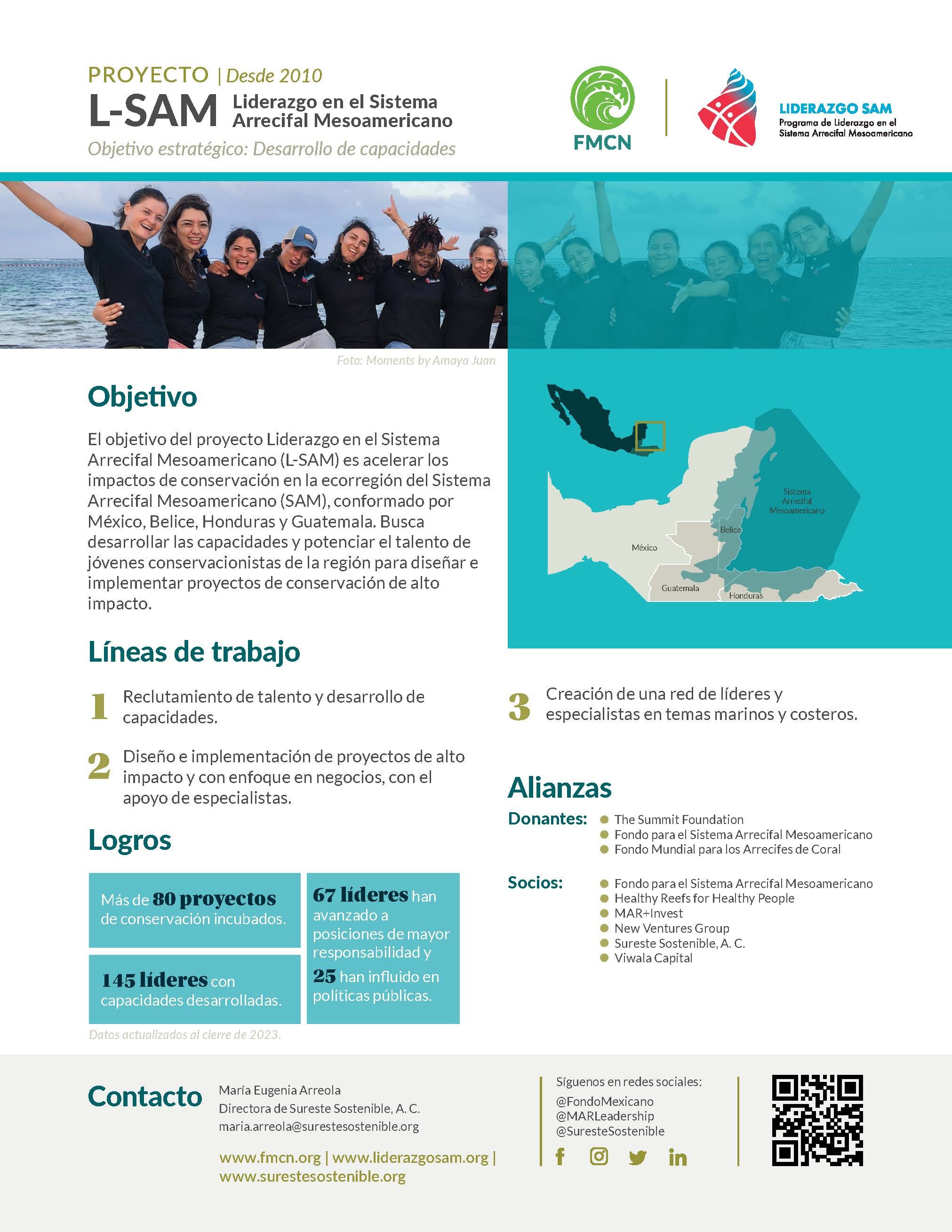A lo largo de15 años de operación, L-SAM ha capacitado a más de 130 líderes provenientes de México, Belice, Guatemala y Honduras y ha incubado a más de 65 proyectos de conservación. Más de 60 líderes se han posicionado en puestos de mayor responsabilidad y 25 líderes han influido en las políticas públicas de su país. Las conexiones creadas durante el programa han dado origen a 38 sinergias multinacionales y más de 25 líderes han recibido financiamiento del Fondo para el Sistema Arrecifal Mesoamericano (Fondo SAM) para implementar sus proyectos y brindar consultorías.