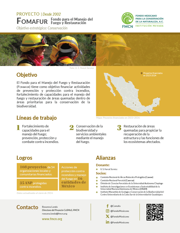 Fomafur ha apoyado 108 proyectos de 54 organizaciones locales y comunitarias para desplegar acciones de protección contra incendios y manejo del fuego en 35 Áreas Naturales Protegidas (ANP) y sus áreas de influencia en 16 entidades de México.